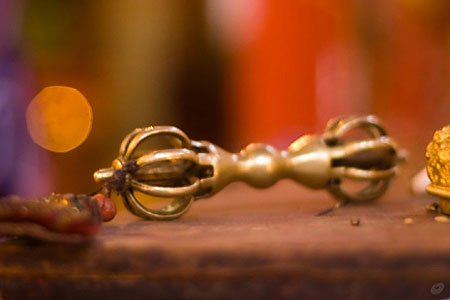 El vajra (o dorje en tibetano) se asocia al budismo tántrico, es el implemento que el lama o el maestro budista generalmente sostiene en su mano derecha. Representa autoridad espiritual y es denominado "cetro diamantino". El vajra simboliza el punto central y sugiere centralidad, constituye el eje, la estabilidad y la imperturbabilidad, también esta asociado a el Buda Akshobya el Buda azul cuyo nombre significa "inquebrantable" o "imperturbable".