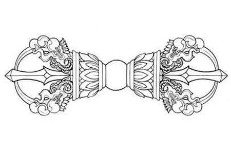 En medio está formado por una esfera, saliendo de cada lado de ésta una flor de loto, algunas veces de cuatro pétalos y otras de ocho. De cada uno de los lotos se desprenden cinco rayos, de algunos vajras se desprenden nueve. Uno de los rayos forma el eje central, de tal manera que hay una biela que atraviesa todo el vajra. Los otros cuatro rayos se despliegan en las cuatro direcciones cardinales, después se curvan para unirse al rayo central nuevamente, en el que todos convergen. La parte de cada rayo más cercana al loto tiene forma de hoja, aunque, de hecho, no lo sea. Realmente se trata de la cabeza de una extraña bestia. En algunos vajras podemos distinguir esto de una manera clara, mientras que en otros se ha estilizado tanto a la bestia que no es posible reconocerla.