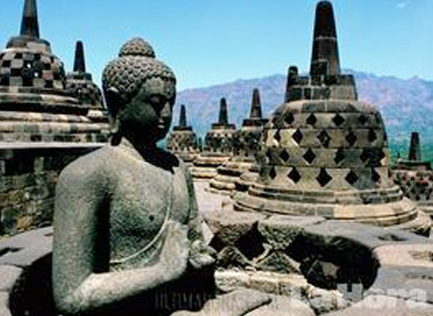 El templo de Borobudur, la atracción turística más visitada de toda Indonesia, es una construcción piramidal formada por 60.000 metros cúbicos de piedra, 2.500 relieves y centenares de figuras de Buda, que fue levantado en el siglo IX.