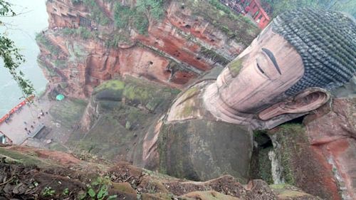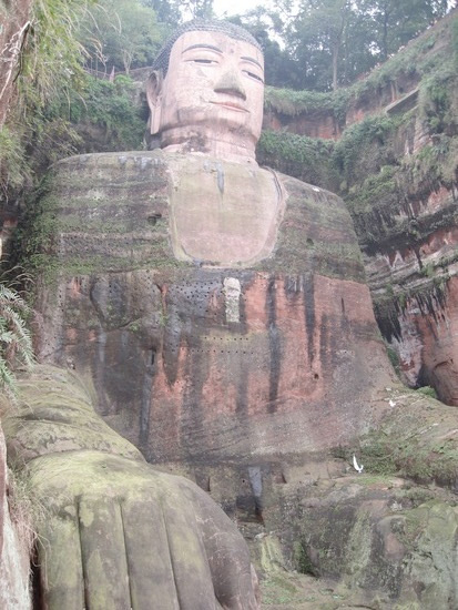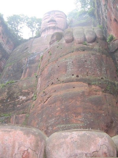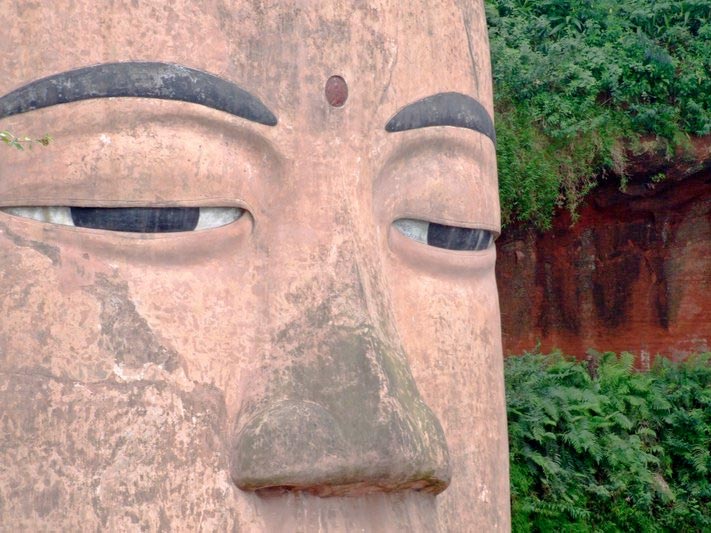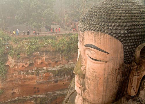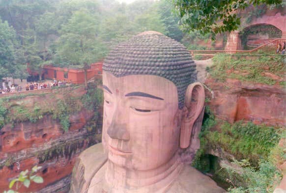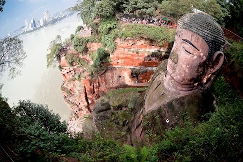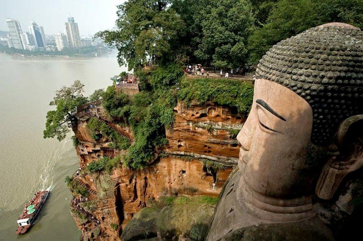 Las vistas desde los pies del Buda son igualmente imponentes, ya que la figura se alza majestuosa sobrecogiendo a cualquier espectador. También podemos montar en un ferry para ver una vista panorámica del Buda desde el río. Existe un dicho en la zona que reza así: “La montaña revela al Buda y el Buda esconde la montaña”. Esto se corresponde con la vista que podemos ver cuando navegamos por el rio, con la imagen de la montaña y el Buda en su corazón durmiendo apaciblemente.